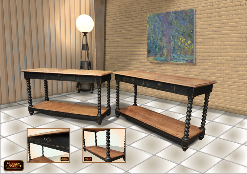 Two wonderful 1900’s wooden draper’s consoles made of original elm and reclaimed pine wood with beautiful twisted legs. The furniture was used by a cloth merchant to display the products in shops.
